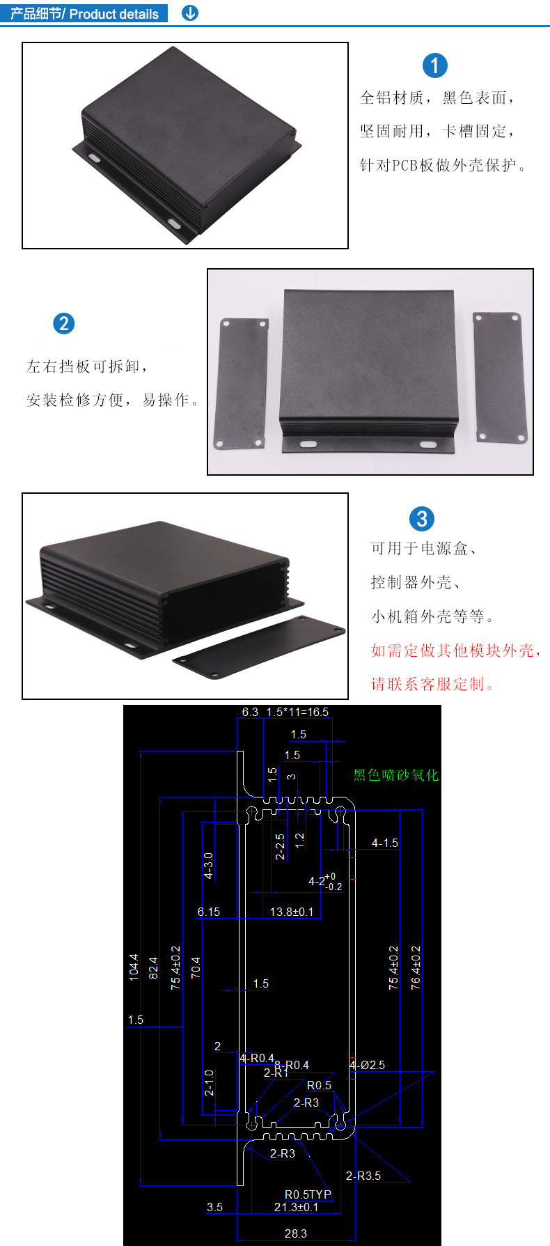 特點:1.全鋁材質(zhì),黑色表面,堅固耐用,卡槽固定,針對PCB板做外殼保護。